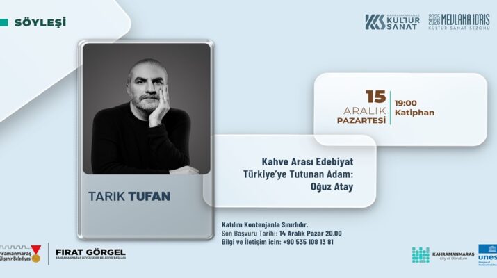 Türkiye’nin tek UNESCO Edebiyat Şehri Kahramanmaraş, kültür ve sanatın merkezi olma vizyonunu güçlendiren etkinliklere bir yenisini daha ekliyor. Kahramanmaraş Büyükşehir Belediyesi, Aralık ayı kültür sanat programı kapsamında edebiyat dünyasında derin izler bırakan isimleri okurlarla bir araya getirmeyi sürdürüyor. Bu kapsamda, farklı yaş gruplarına yönelik faaliyetlerini kesintisiz sürdüren Büyükşehir Belediyesi, 15 Aralık Pazartesi günü yazar Tarık Tufan’ın katılımıyla özel bir söyleşi düzenleyecek. Katiphan’da gerçekleştirilecek etkinlik saat 19.00’da başlayacak. “Türkiye’ye Tutunan: Oğuz Atay” konulu söyleşide Tarık Tufan, Türk edebiyatının en etkili kalemlerinden Oğuz Atay’ın edebi yolculuğunu, eserlerinin arka planını ve edebiyata kattığı yenilikleri kendine özgü anlatımıyla ele alacak. Okurlar, Atay’ın yazın hayatına dair farklı ve derinlikli bir perspektife tanıklık etme fırsatı bulacak. Kontenjanla sınırlı etkinliğe katılmak isteyen edebiyatseverler, 0535 108 13 81 numaralı hat üzerinde irtibata geçerek bu özel etkinlik için yerini ayırtabiliyor.