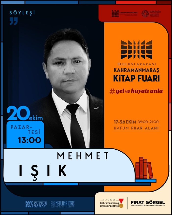 10. Uluslararası Kahramanmaraş Kitap Fuarı’nda 20 Ekim Pazartesi günü; Tarihçi ve Yazar Mehmet Işık ve Türk öykü ve roman yazarı Güray Sürgü, fuarda kitapseverlerle bir araya gelerek söyleşi gerçekleştirecek.
