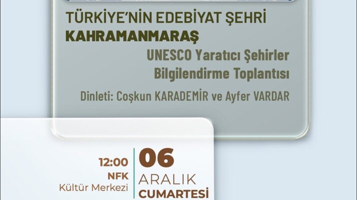 Kahramanmaraş Büyükşehir Belediyesi, sosyal belediyecilik anlayışı çerçevesinde kültür ve sanat etkinliklerini vatandaşlarla buluşturmaya devam ediyor. Türkiye’nin ilk UNESCO Edebiyat Şehrinde kültür sanat faaliyetlerini artırarak sürdüren Büyükşehir Belediyesi, Mevlâna İdris Kültür Sanat Sezonu kapsamında 6 Aralık Cumartesi günü saat 12.00’da Necip Fazıl Kısakürek Kültür Merkezi’nde UNESCO Yaratıcı Şehirler Bilgilendirme Toplantısı gerçekleştirilecek.  UNESCO Yaratıcı Şehirler Ağı’na ‘Edebiyat’ alanında Türkiye’den dahil olan ilk şehir Kahramanmaraş’ın güçlü şairlik geleneği, edebi kimliği, ulusal ve uluslararası düzeyde görünür kılınması gibi konular toplantıda ele alınacak. Ayrıca programda sevilen müzisyenler Ayfer Vardar ve Coşkun Karademir’de müzik ziyafeti sunacak. Büyükşehir Belediyesinden yapılan açıklamada, bilgilendirme toplantısı ve müzik ziyafetine tüm vatandaşlar davet edildi.