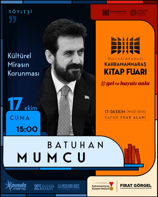 Büyükşehir Belediyesi tarafından bu yıl 10’uncusu düzenlenecek Uluslararası Kahramanmaraş Kitap Fuarı’nın ilk günü olan 17 Ekim Cuma günü düzenlenecek konferanslarda; AK Parti Kültür ve Sanat Politikalarından Sorumlu Genel Başkan Yardımcısı Hüseyin Yayman ve AR-GE ve Eğitimden Sorumlu Genel Başkan Yardımcısı Mustafa Şen ile Kültür ve Turizm Bakan Yardımcısı Dr. Batuhan Mumcu, kültür sanat dostlarıyla bir araya gelecek.