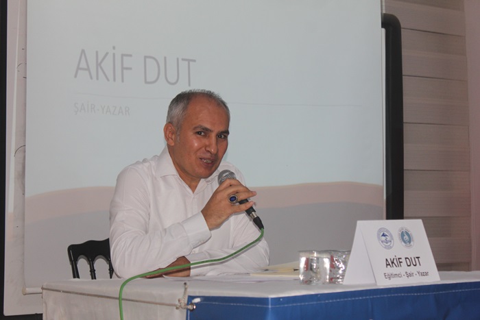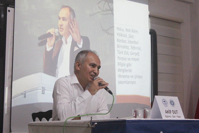 Programda kürsüye çıkan Eğitimci,Şair,Yazar Akif Dut, kendisini bugün yalnız bırakmayan herkese teşekkür ederek, hem kendisini,hem edebiyata katkılarını hem de yayınlanan eserlerini anlattı. Sözlerini ise şiirle bitirdi.