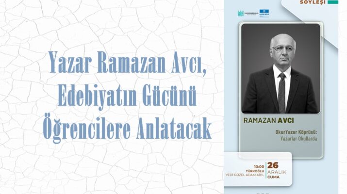 Büyükşehir Belediyesinin “Yazarlar Okullarda” programı kapsamında yazar Ramazan Avcı, 26 Aralık Cuma günü Türkoğlu Yedi Güzel Adam Anadolu İmam Hatip Lisesi’nde öğrencilerle bir araya gelecek.